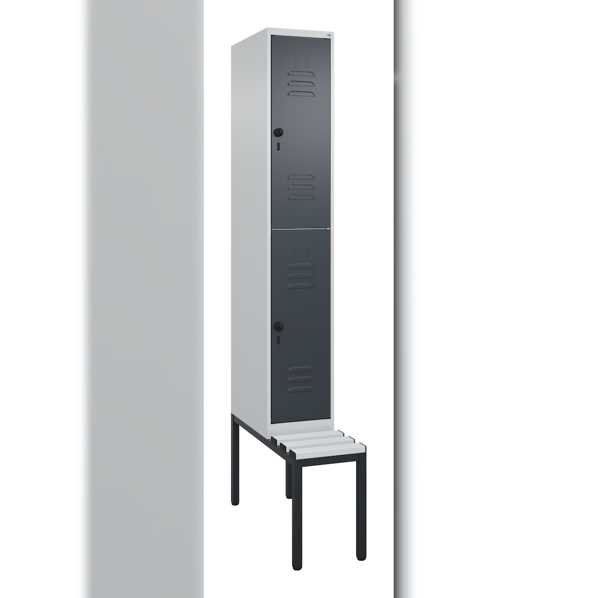 C+P Spind Classic PLUS, Kunststoff untergebaute Sitzbank, 2 Abteile, HxBxT 212x30x82cm, Sicherheitsdrehriegel, Hellgrau/Anthrazit von PROREGAL