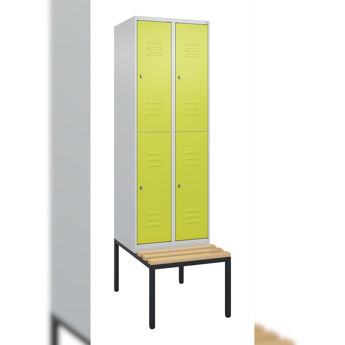 C+P Spind Classic PLUS, Buche untergebaute Sitzbank-Harthol, 4 Abteile, HxBxT 212x60x82cm, Zylinderschloss, Hellgrau/Clowngrün von PROREGAL