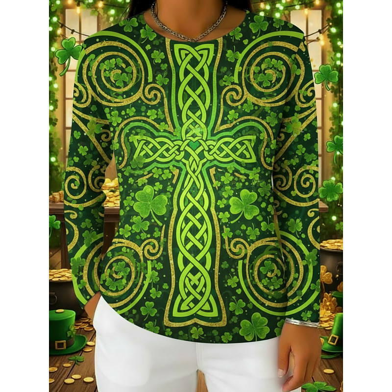 St. Patrick's Day Women's T Shirt Shamrock Cross Fashion Stylish Classic Long Sleeve Crew Neck Regular Tops Daily Weekend Vacation Wear Print Light Green Dark Green Green Summer Spring Fall