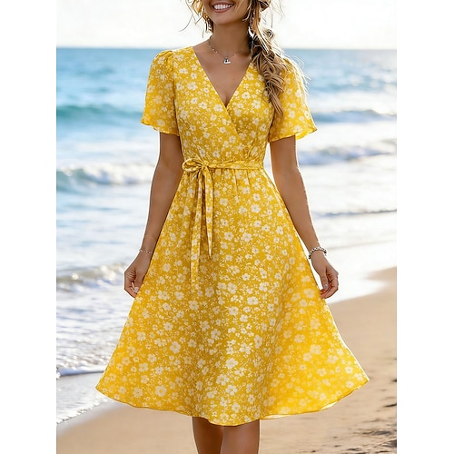 Per donna Abito Midi Vestito Casual Abito a trapezio Elegante Vacanza Carino Ferie Data Vestibilità regolare Floreale Grafico Manica Corta Scollo a V Blu Giallo Rosa Viola Estate Primavera Autunno