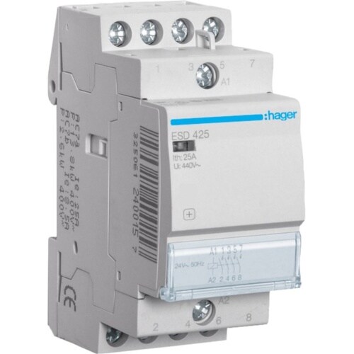 Hager Installationsschütz, 25A, 24V/AC, 400V/AC/DC, 4S, 1900W/AGL, 950VA/LL, 2TE