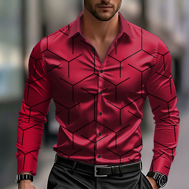 Men's Geometric Pattern Line Shirt Satin Shirt Dress Shirt Long Sleeve Business Casual Vacation Dailywear Summer Spring Fall Turndown 3D Print Button Up Shirts Blue White Pink Red Green