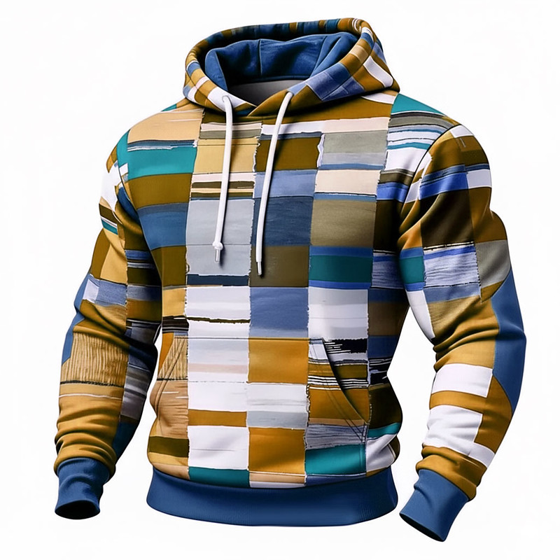 Men's Geometric Plaid Hoodie Sweatshirt Fashion Daily Crew Neck Home Streetwear Party Blue Brown Green Khaki Drawstring Fall Winter Designer S M L XL XXL XXXL