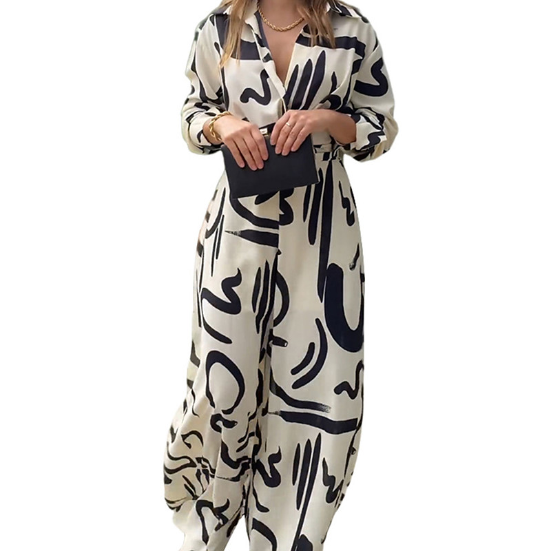 Women's Normal Jumpsuit Stylish Geometric Long Sleeve Shirt Collar Belted Vacation Party Loose Fit White Spring