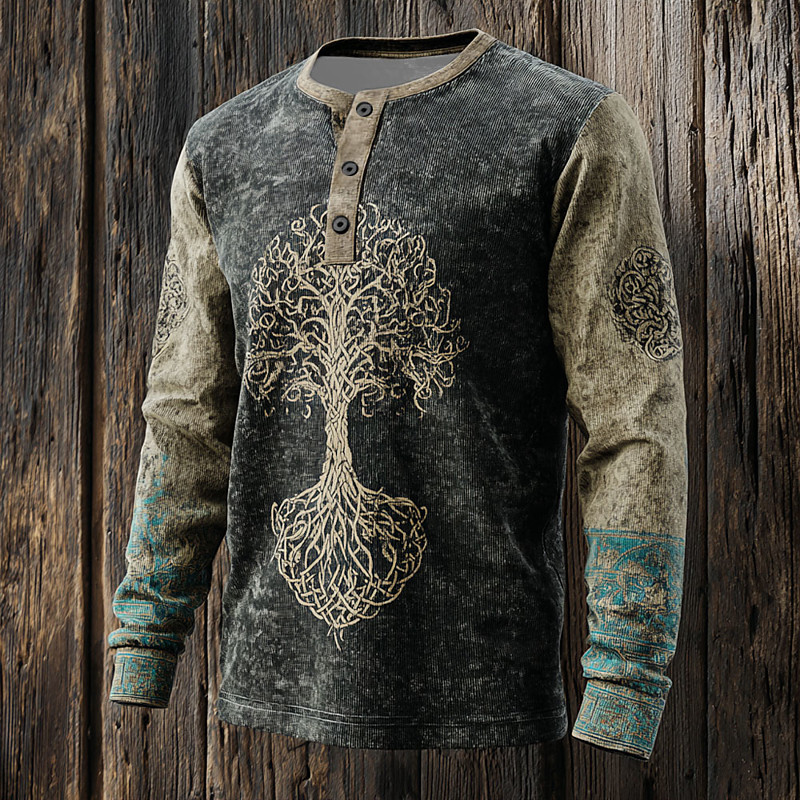 Men's Graphic Tree Henley Shirt Graphic Tee Long Sleeve Vintage Fashion Cute Casual Holiday Going out Spring Fall Spring Fall Black Henley Henley T-Shirt