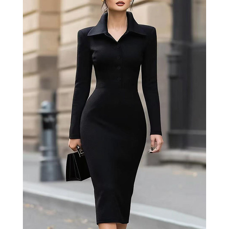 Women's Midi Dress Black Dress Sheath Dress Elegant Fashion Modern Daily Going out Weekend Regular Fit Plain Long Sleeve Shirt Collar Black Spring Fall Winter