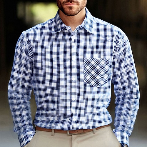 Per uomo Camicia Camicia elegante Camicia con Bottoni Plaid Matrimonio Quotidiano Blu marino Manica Lunga Collo ripiegato Primavera Autunno Abbigliamento Tasca Frontale