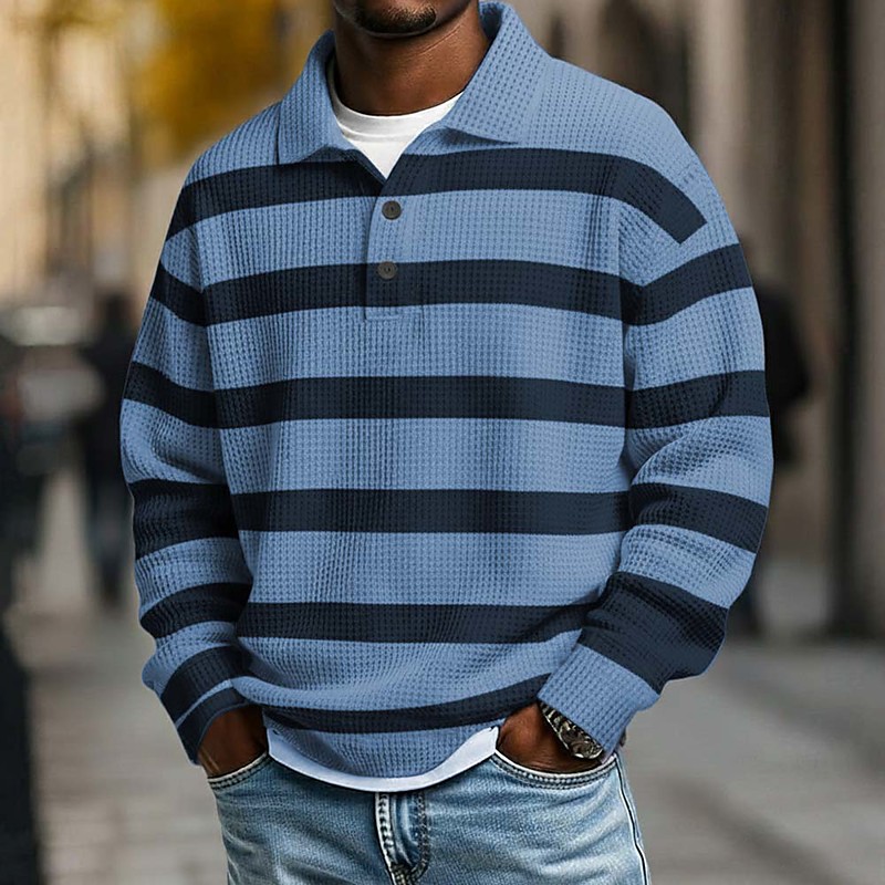 Men's Horizontal Stripes Waffle Polo Shirts Rugby Polo Rugby Polo Shirts Long Sleeve Polo Shirts Lapel Sportswear Casual School Athleisure Daily Wear 3D Print Spring Fall Winter Blue Sky Blue Apricot