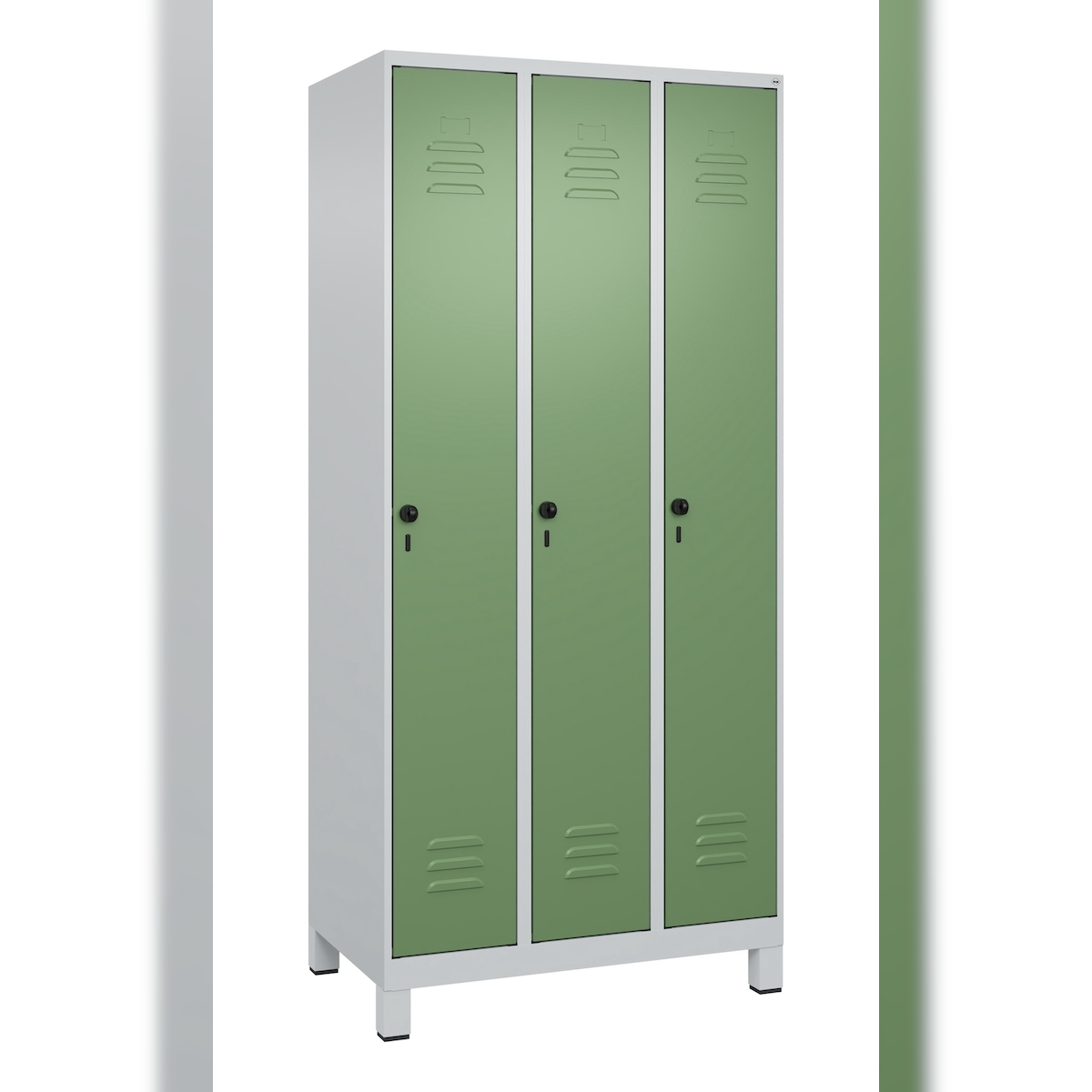 C+P Spind Classic PLUS, Füßen, 3 Abteile, HxBxT 195x90x50cm, Sicherheitsdrehriegel, Hellgrau/Resedagrün von PROREGAL