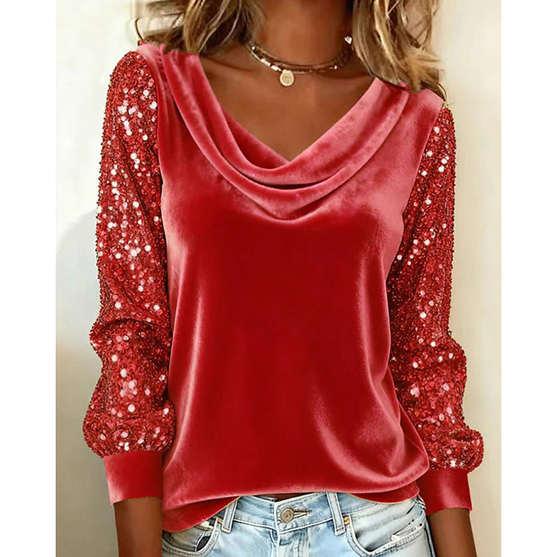 Women's Blouse Dressy Tops Sequin Tops Plain Elegant Vintage Ladies Long Sleeve Cowl Neck Regular Tops Daily Work Holiday Ruched Sequins Patchwork Blue Black Pink Red Purple Fall Winter
