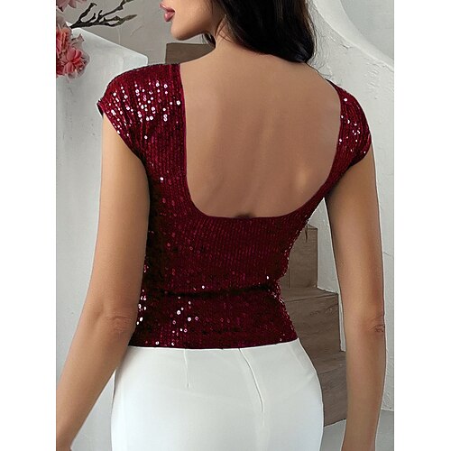 Per donna Blusa Tinta unica Elegante Casual Manica Corta Girocollo Top Regolari Ferie Uscire Paillettes Nero Vino Verde Estate Primavera