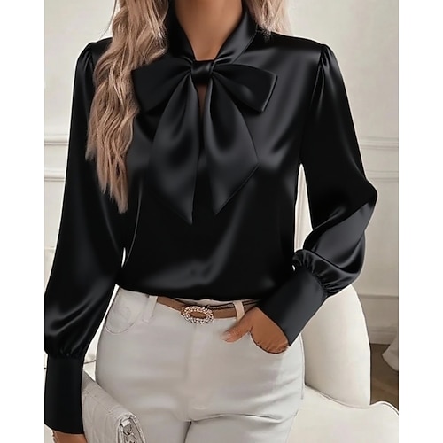 Per donna Camicia Elegant Elegante Raso/Satin Semplice Elegante Manica Lunga Scollo a V Top Regolari Lavoro Ferie Uscire Fiocco Nero Bianco Rosa Cachi Primavera Autunno