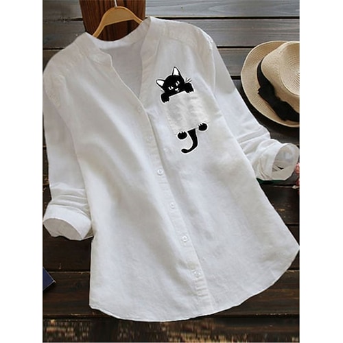 Per donna Camicia Blusa Camicie di cotone e lino Gatto Essenziale Moderno Scollo a V Quotidiano Stampato Bianco Giallo Verde militare Rosso Estate