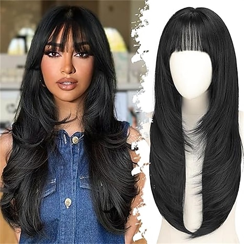 parrucca lunga bionda con frangia a tendina - parrucche ondulate a strati lunghe 26 pollici per donne - parrucche sintetiche Sabrina taglio di capelli a farfalla dall'aspetto morbido e naturale per