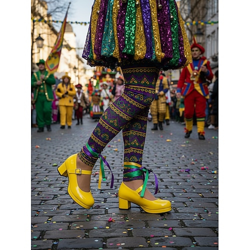 Frauen Mardi Gras Gelbe Lackleder Mary Jane High Heels mit Blockabsatz – Retro-Stil bequeme Passform perfekt für Karneval Festivals und Kostümpartys