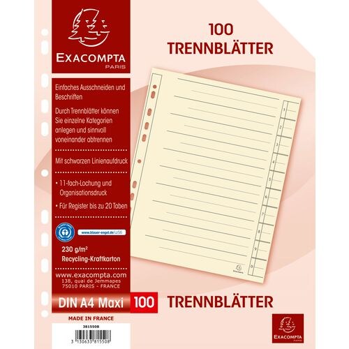 Exacompta 1 bis 10 Trennblätter 95% Recycelt DIN A4 Chamois 10-teilig Pappkarton 11 Löcher 381550B 100 Stück