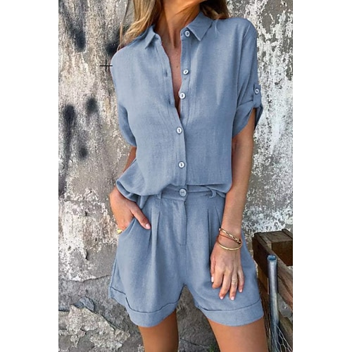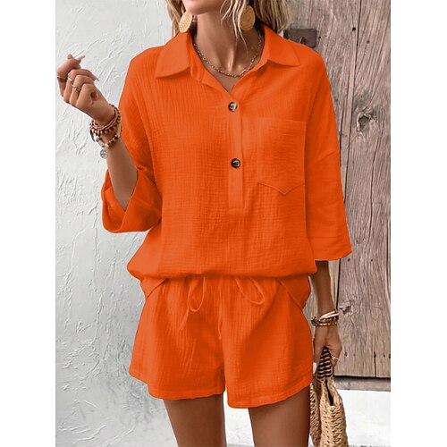 Per donna Set di biancheria in cotone Set di Pantaloncini Mezza Manica Colletto a Camicia Tinta unica Elegante Moda Streetwear Casuale Quotidiano All'aperto Blu Nero Bianco Estate Vestibilità regolare