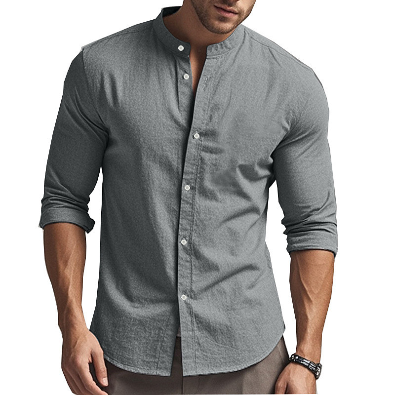 Men's Cotton Linen Shirt Plain Vacation Black White Khaki Dark Gray Long Sleeve Grandad Collar Clothing Apparel