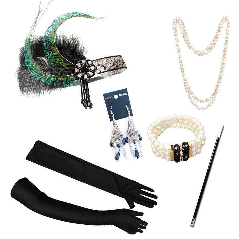 Setswith Flapper Dress Feather Headband Gloves Necklace 4 PCS Roaring 20s 1920s Cocktail Dress Masquerade The Great Gatsby Sequins Tassel Fringe Costumes Women's Attire Christmas Party