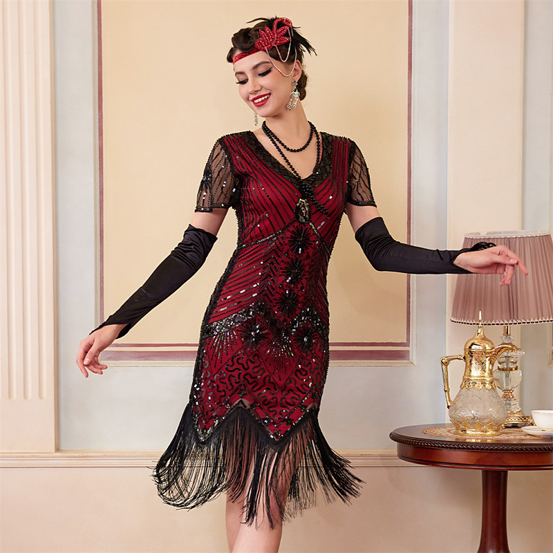 Roaring 20s 1920s Knee Length Flapper Dress Short Sleeves The Great Gatsby Sequins Fringe V Neck Fancy Dress Women's Christmas Carnival Masquerade Retro Theme Party Charleston Dance Adults' Dress