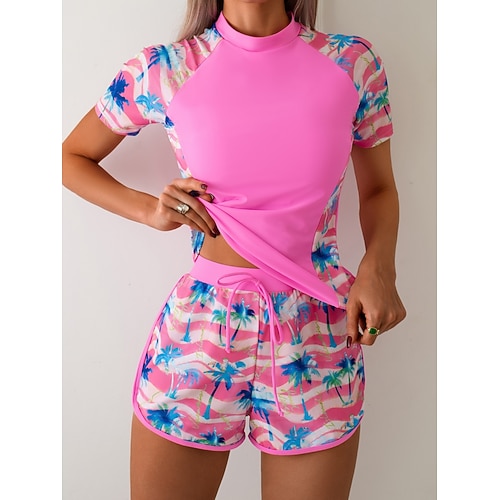 Per donna Costumi da bagno Tankini Due pezzi Shorts Costume da bagno Controllo della Pancia Vita alta Snello Senza schiena Vacanza Abbigliamento da Spiaggia Grafico Collo Alto Maniche Corte Costumi