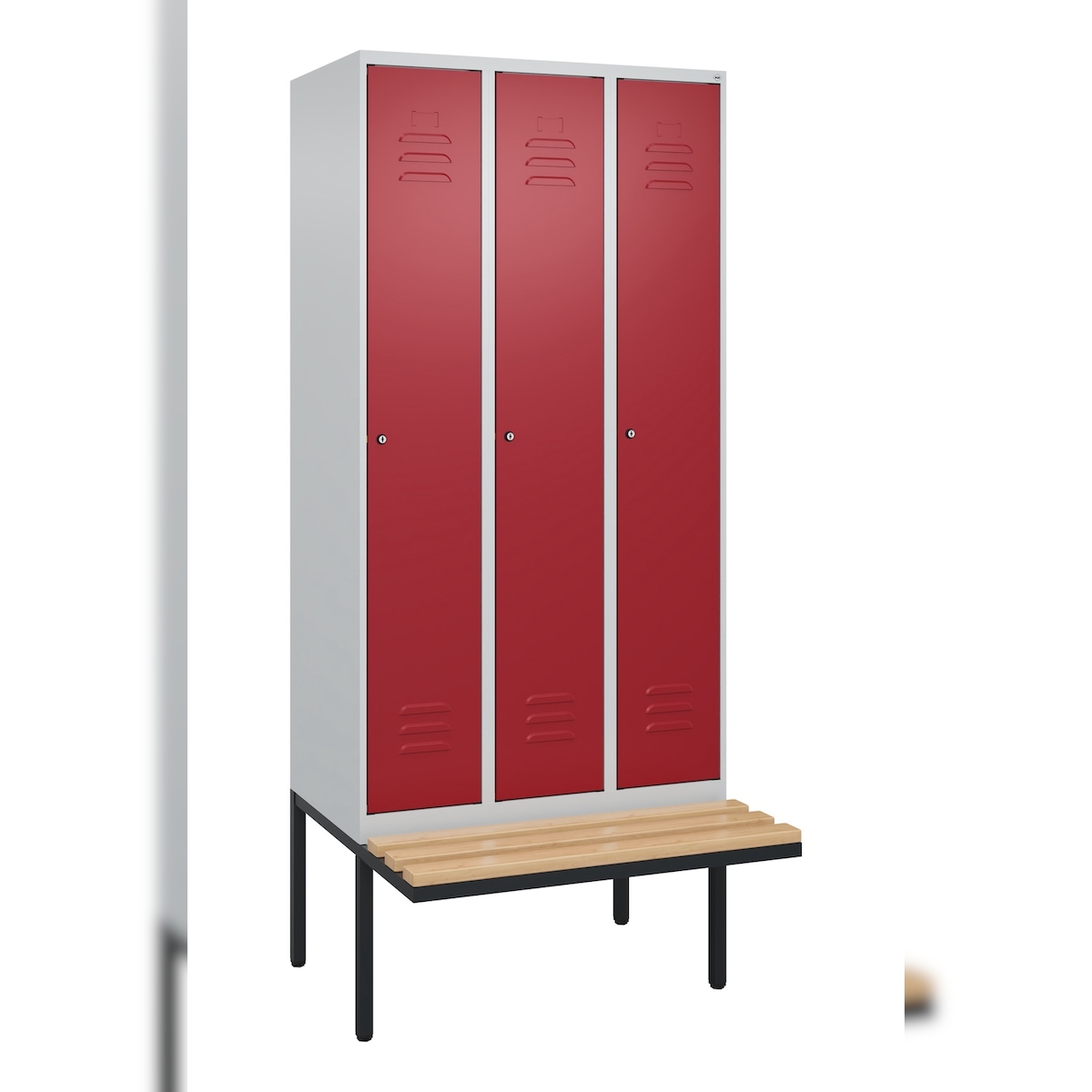 C+P Spind Classic PLUS, schwebender Sitzbank aus Buche 3 Abteile, HxBxT 212x90x82cm, Zylinderschloss, Hellgrau/Rubinrot von PROREGAL