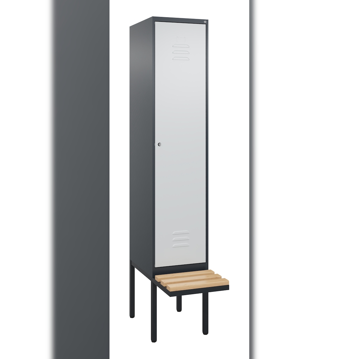 C+P Spind Classic PLUS, schwebender Sitzbank aus Buche 1 Abteil, HxBxT 212x40x82cm, Zylinderschloss, Anthrazit/Hellgrau von PROREGAL