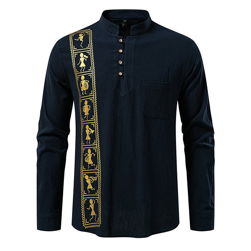 Men's Shirt Linen Shirt Popover Shirt Casual Shirt Cotton Shirt Graphic Prints Vacation Hawaiian Black White Navy Blue Khaki Long Sleeve Band Collar Spring Fall Clothing Apparel Print