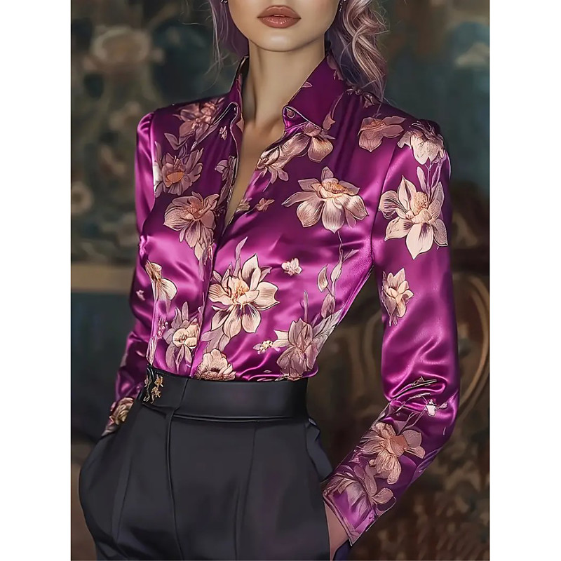Women's Work Shirt Floral Graphic Elegant Stylish Casual Long Sleeve Shirt Collar Regular Tops Work Party Evening Wear Daily Wine Blue Purple Fuchsia Spring, Fall, Winter, Summer