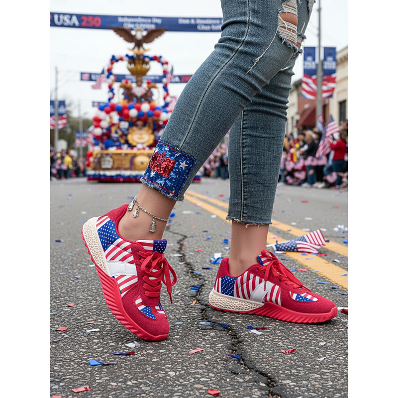 Women's Red American Flag Sneakers – Comfortable Patriotic Lace-up Shoes for 4th of July, Parades and 250th Anniversary Celebrations