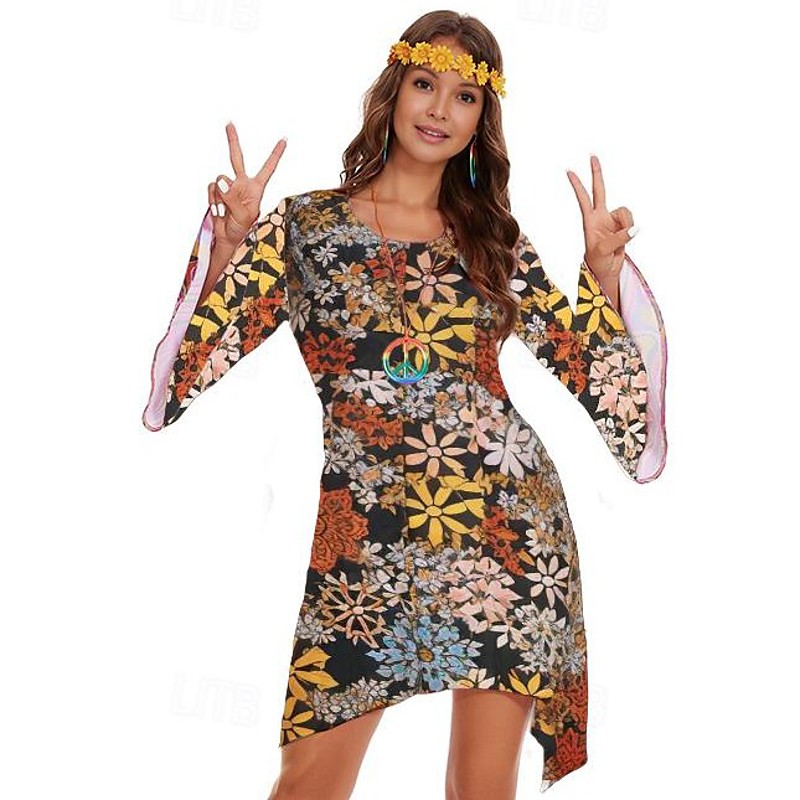 Retro Vintage 1970s 70s Fancy Dress Women Bell Sleeve Hippie Disco Graphic Round Neck Fancy Dress Women's Halloween Carnival Masquerade Party Daily Wear Pride Parade Adults' Dress All Seasons