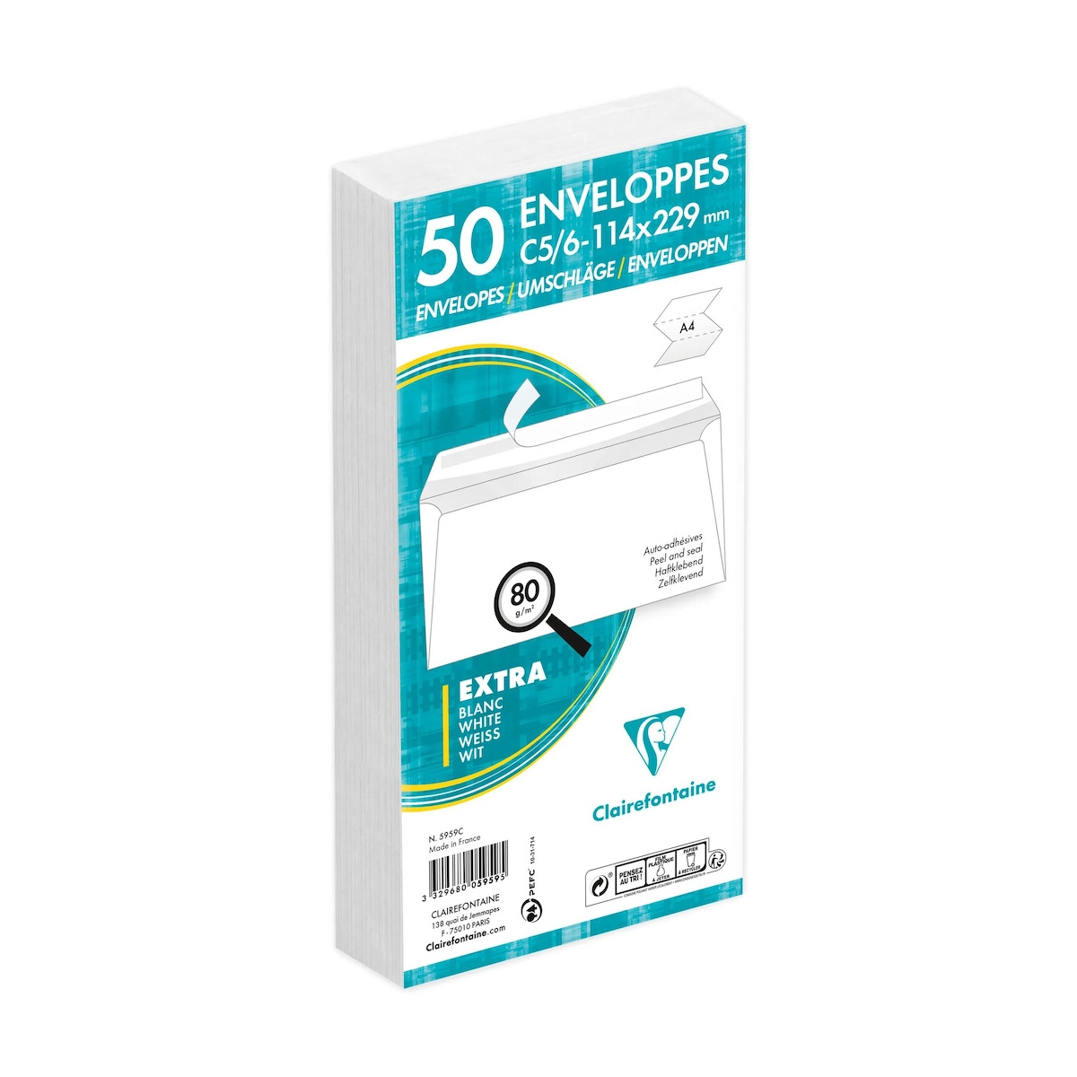 Clairefontaine 500x Packung mit 50 Briefumschlägen C5/6, 114x229mm, haftklebend, 80g, weiß, ohne Fenster - 5959C