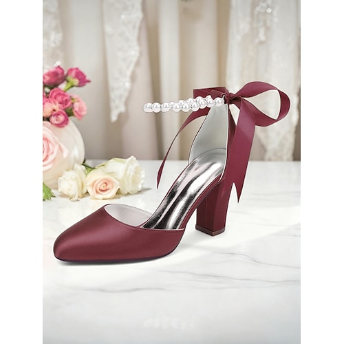 Damen Pumps aus orangefarbenem Satin mit Blockabsatz und Perle Knöchelriemen aus Band – elegante High Heels mit spitzer Spitze für Hochzeiten, Partys Abendveranstaltungen