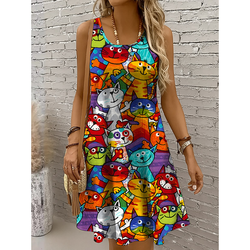 Women's Mini Dress Sundress A Line Dress Off The Shoulder Dress Vacation Casual Holiday Beach Regular Fit Graphic Cat Sleeveless Crew Neck Yellow Red Blue Purple Summer Spring