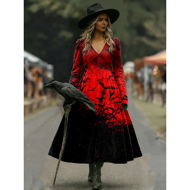 Women's Witch Print Midi Dress A Line Dress Vacation Casual Daily Regular Fit Floral Graphic Hocus Pocus Long Sleeve V Neck Black Red Brown Spring Fall