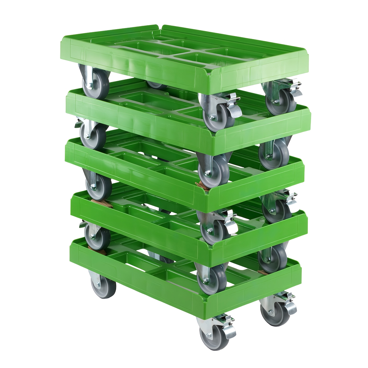 5 Stück Transportroller für Kisten 60 x 40 cm mit 2 Bockrollen und 2 Bremsen grün