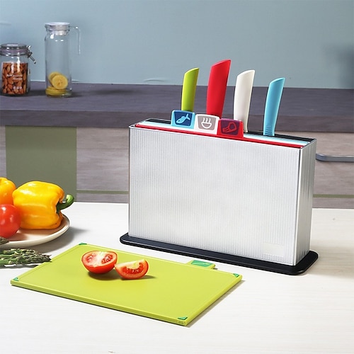 Das lebensmittelechte Schneidebrett wird mit einem Aufbewahrungsgestell geliefert, die Schneideblöcke sind zur übersichtlichen Sortierung beschriftet, es ist leicht zu reinigen und beidseitig