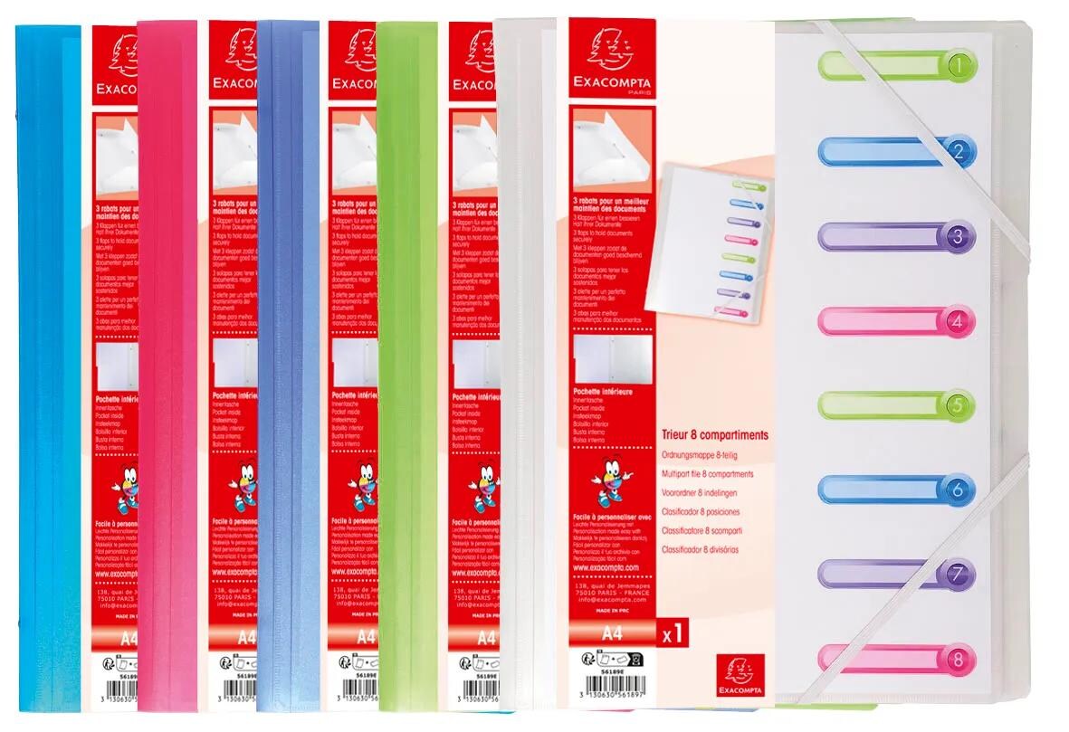 Exacompta 56189E 10x Eckspann-Ordnungsmappe aus Recycling-PP 500µ mit Gummizug und 3 Klappen, 8 Fächer mit Index-Fenstern, DIN A4 - Farben sortiert