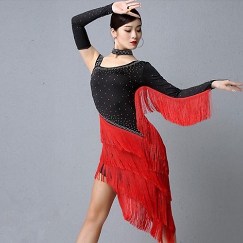 Abito da ballo latino da donna nero e rosso con frange, maniche lunghe e strass, ideale per competizioni di ballo da sala.