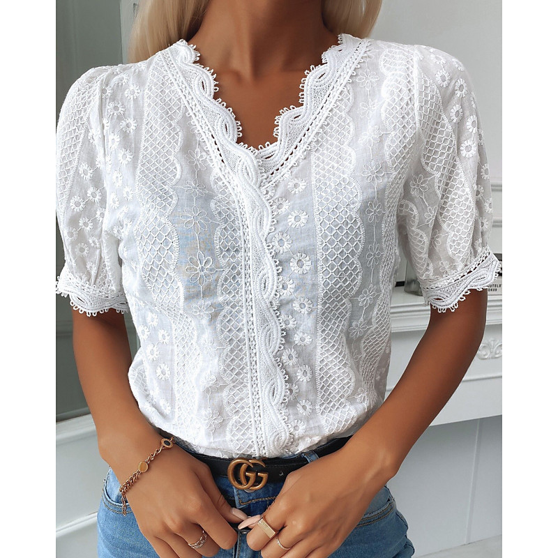 Women's Shirt Blouse White Plain Lace Short Sleeve Daily Weekend Streetwear Casual V Neck Regular S