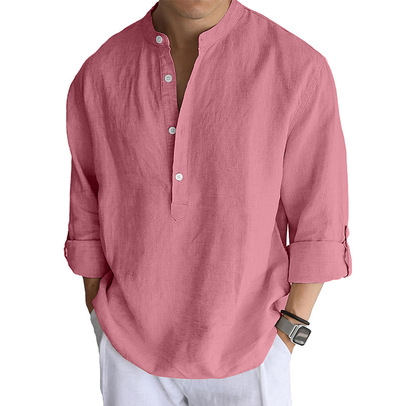 Men's Linen Shirt Popover Shirt Casual Shirt Beach Shirt Band Collar Shirt Plain Beach Vacation Black White Pink Orange Long Sleeve Mandarin Collar Summer Spring Clothing Apparel Plain