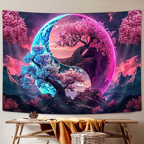 Ästhetischer orientalischer Wandteppich, traditionelle chinesische Tuschemalerei, Landschaft mit roter Pflaumenblüte, Pagode, Bergnebel, ruhige Zen-Dekoration für Meditation und Yogastudio