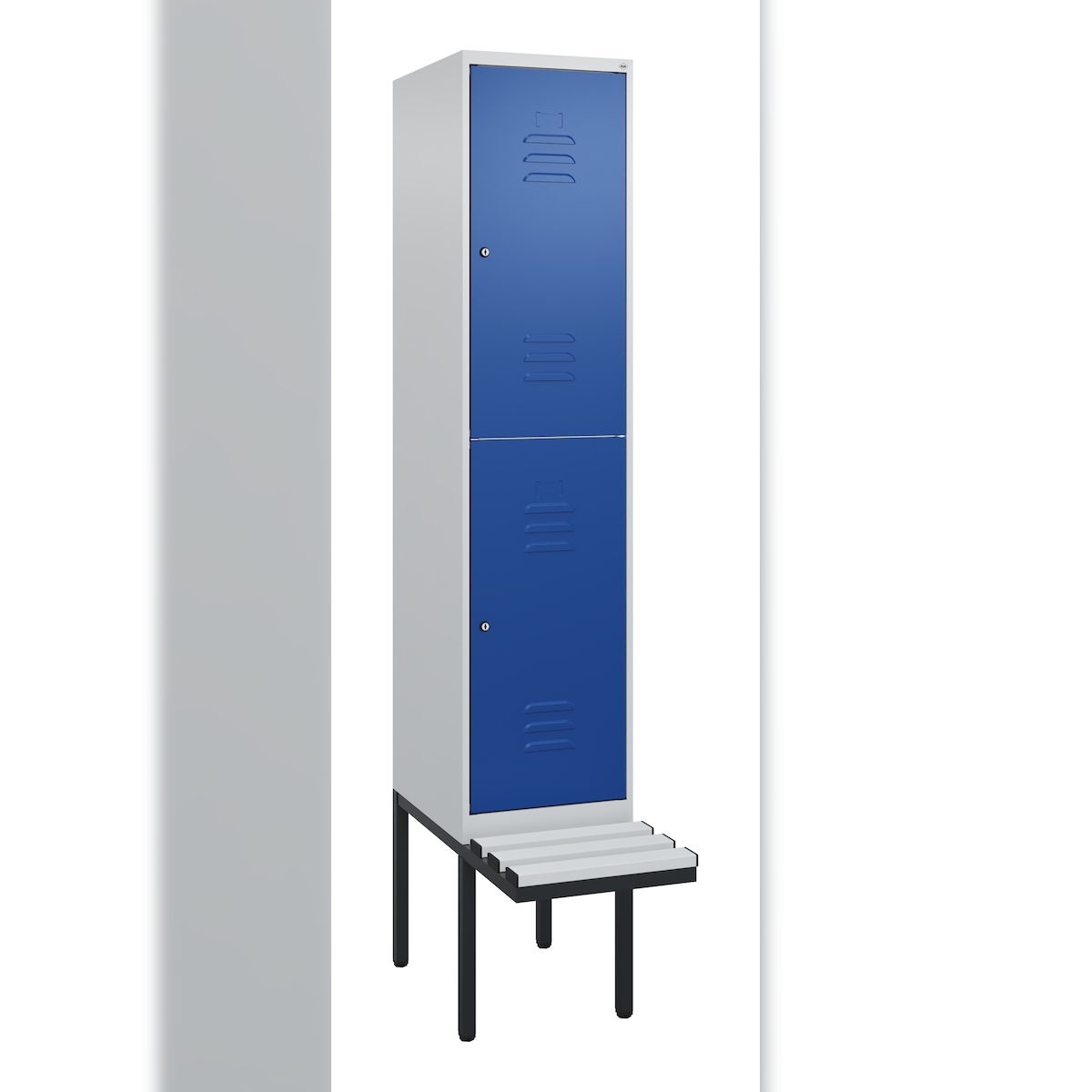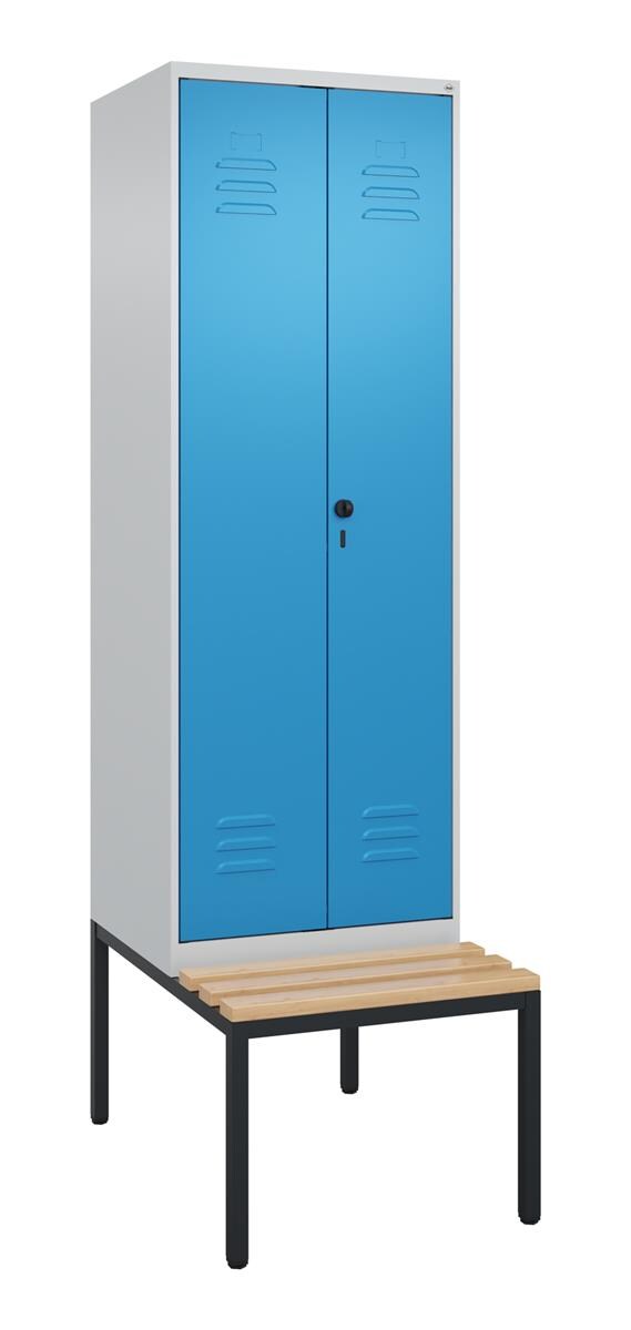 C+P Spind Classic PLUS, Kunststoff schwebende Sitzbank, 2 Abteile, HxBxT 212x40x82cm, Zylinderschloss, Hellgrau/Enzianblau von PROREGAL