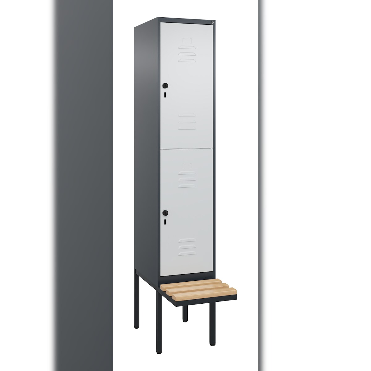 C+P Spind Classic PLUS, Buche schwebende Sitzbank, 2 Abteile, HxBxT 212x40x82cm, Sicherheitsdrehriegel, Anthrazit/Hellgrau von PROREGAL