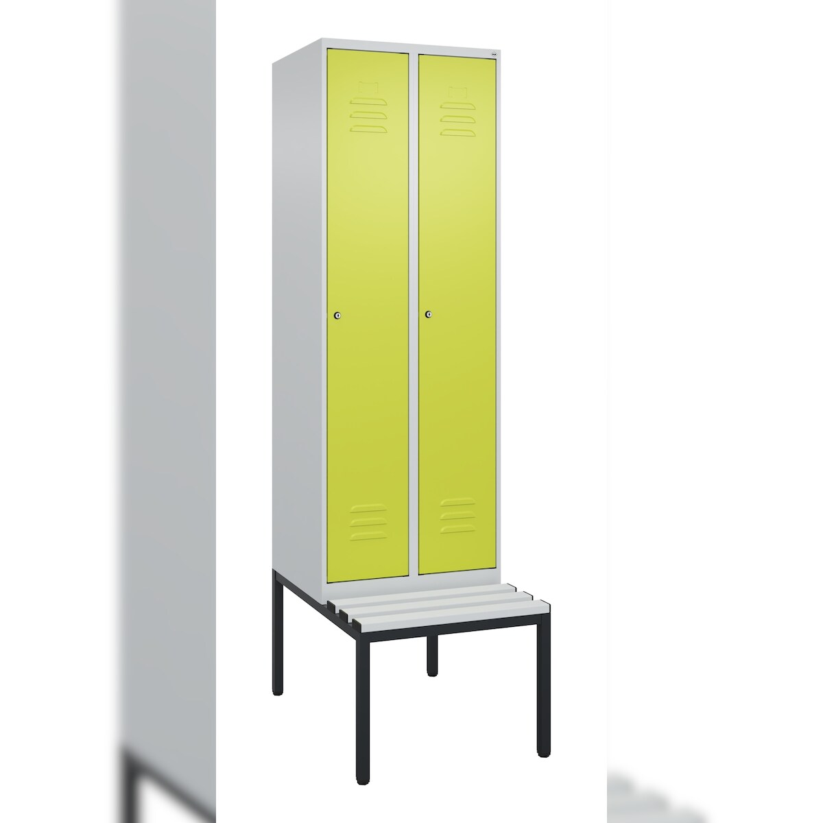 C+P Spind Classic PLUS, Kunststoff untergebaute Sitzbank, 2 Abteile, HxBxT 212x60x82cm, Zylinderschloss, Hellgrau/Clowngrün von PROREGAL