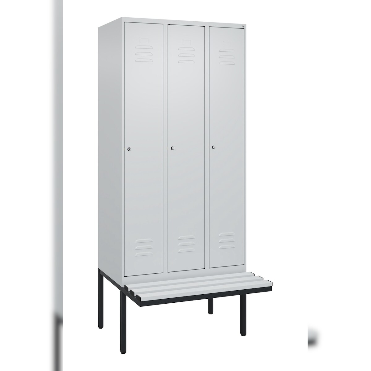 C+P Spind Classic PLUS, Kunststoff schwebende Sitzbank, 3 Abteile, HxBxT 212x90x82cm, Zylinderschloss, Hellgrau/Hellgrau von PROREGAL