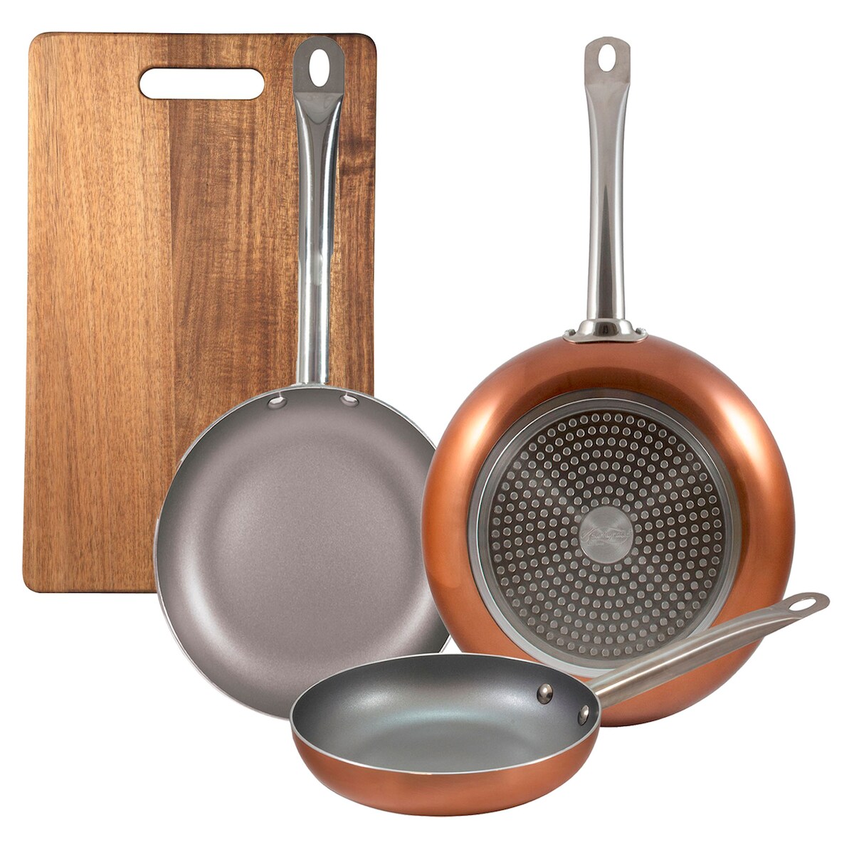 BERGNER - Set aus 3 gepressten Aluminium-Pfannen Ø18/Ø22/Ø26 cm, geeignet für Induktion Optimum Plus Schneidebrett 40,3x25,2x2,5 cm aus Holz