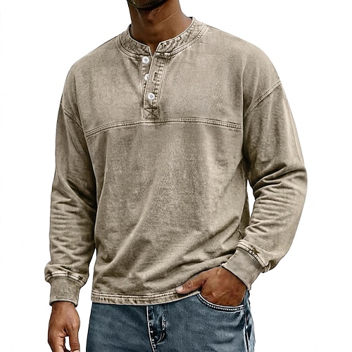 Per uomo Maglia Henley Camicia 100% cotone lavaggio acido Maglietta Manica Lunga Semplice Vintage Retrò Vintage Casual Stile Vintage Lavato Henley Casuale Primavera Autunno Tutte le stagioni Nero