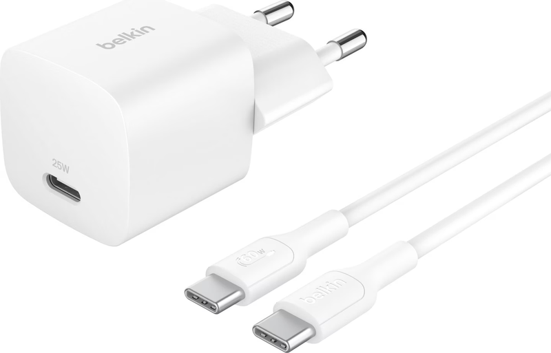 Belkin USB-C Ladegerät, 25W mit 60W USB-C Kabel (1m) – PD 3.0 Schnellladeadapter mit PPS für Apple iPhone 16 Serie, iPad Pro, Samsung Galaxy S25, Nintendo Switch und mehr – Weiß