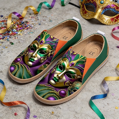 scarpe casual in tela slip-on da donna con stampa di maschere di carnevale - calzature leggere, comode e larghe per sfilate di carnevale, feste di strada, feste a tema e uscite estive quotidiane